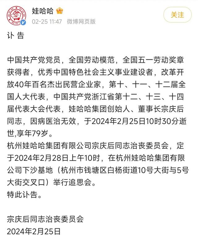 近日,改革开放后第一代浙商代表性人物宗庆后溘然长逝。2月25日娃哈哈发布讣告:娃哈哈集团创始人、董事长宗庆后同志,因病医治无效,于2024年2月25日10时30分因病医治无效,在杭州逝世,享年79岁。